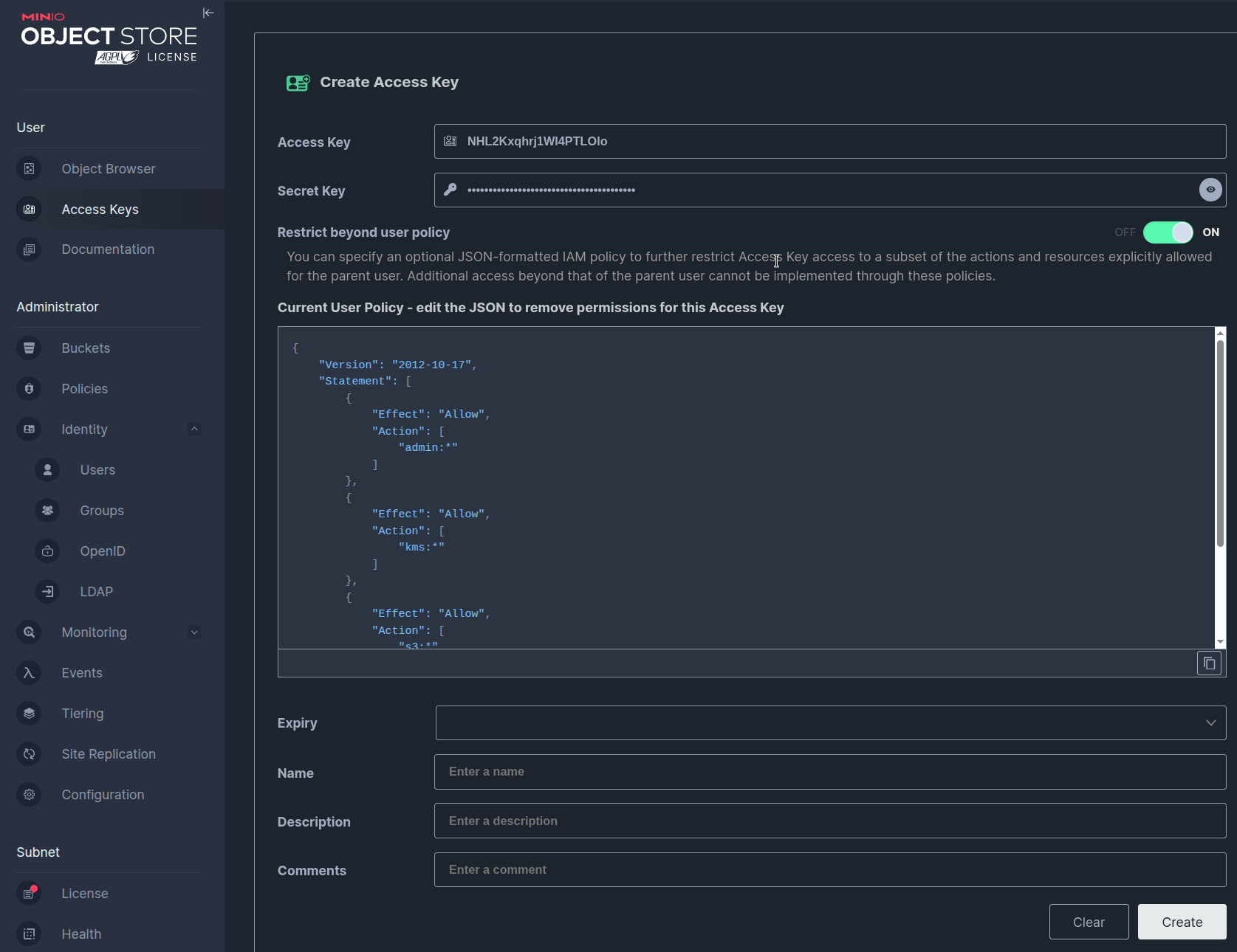 - It is recommended you enable the "Restrict beyond user policy" toggle and further limit the access key permissions. More details can be found in Modifying Access Key Permissions